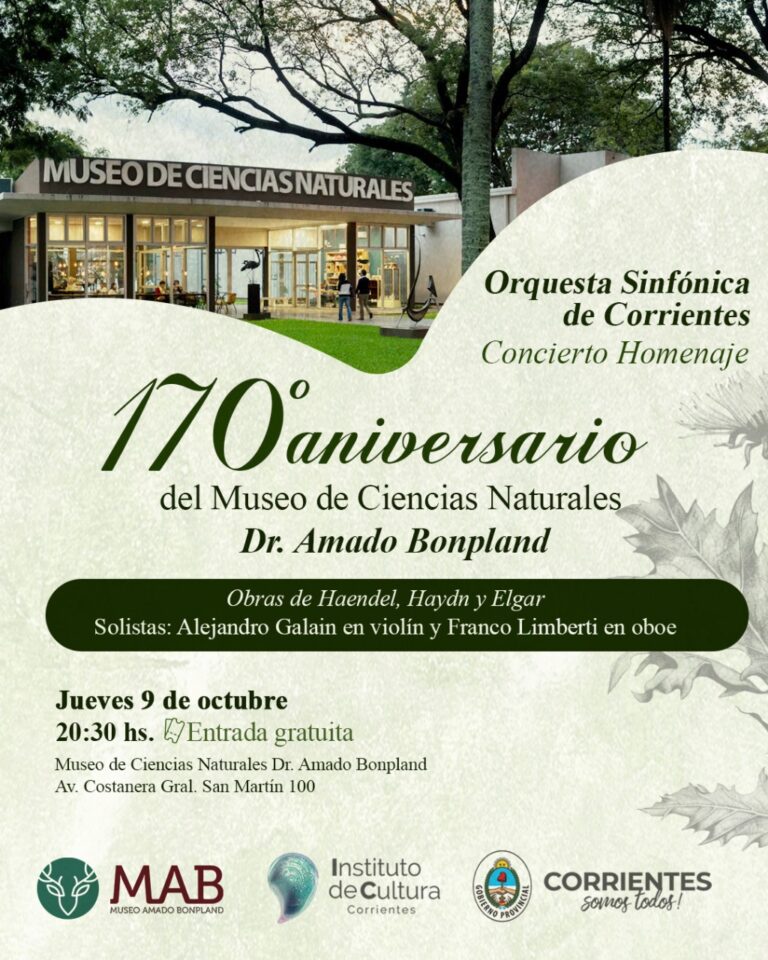 En el marco de las celebraciones por el 170º aniversario de su fundación, el Museo de Ciencias Naturales Amado Bonpland (Av. Costanera Gral. San Martín 100) será el escenario de un concierto especial a cargo de la Orquesta Sinfónica de…