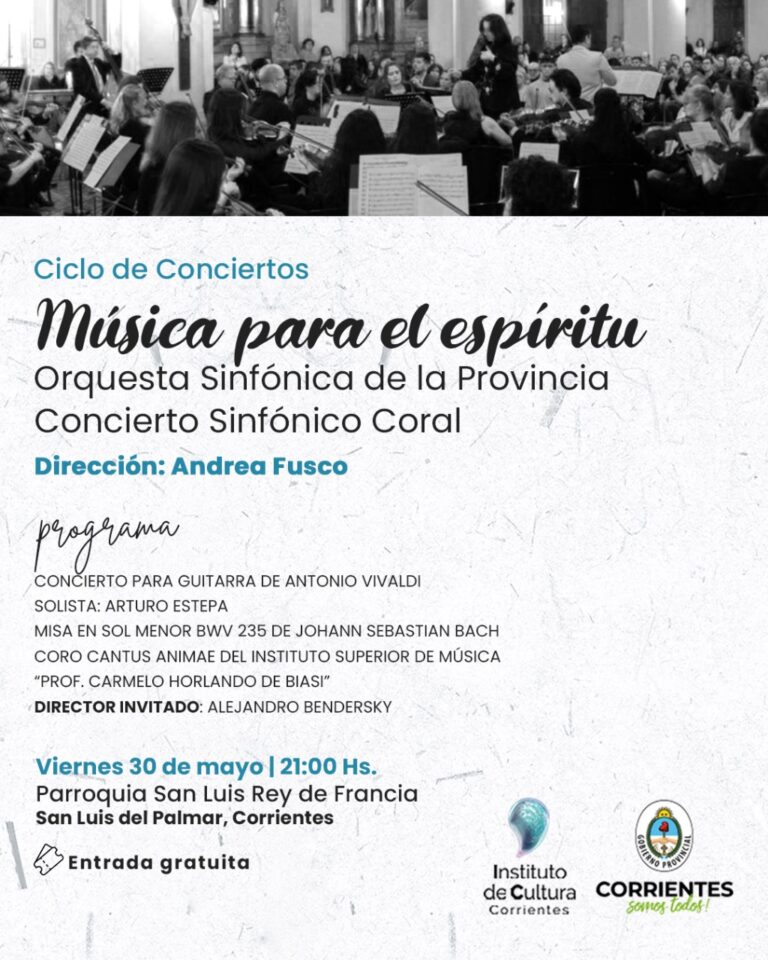 El Gobierno de Corrientes, a través del Instituto de Cultura, invita al Concierto Sinfónico Coral que se realizará este viernes 30 de mayo, a las 21, en la iglesia de San Luis Rey de Francia, de la localidad de San…