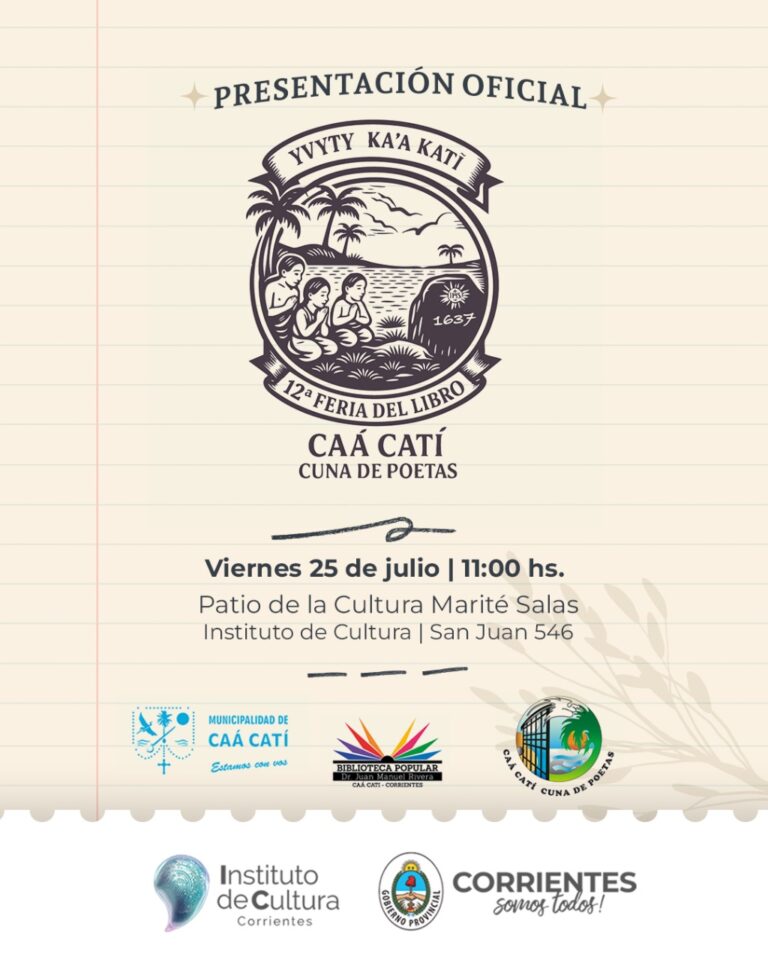 Este viernes 25 de julio, a las 11, en el Patio de la Cultura Marité Salas del Instituto de Cultura de la Provincia, se realizará la presentación oficial de la 12ª Feria del Libro de Caá Catí. El evento se…