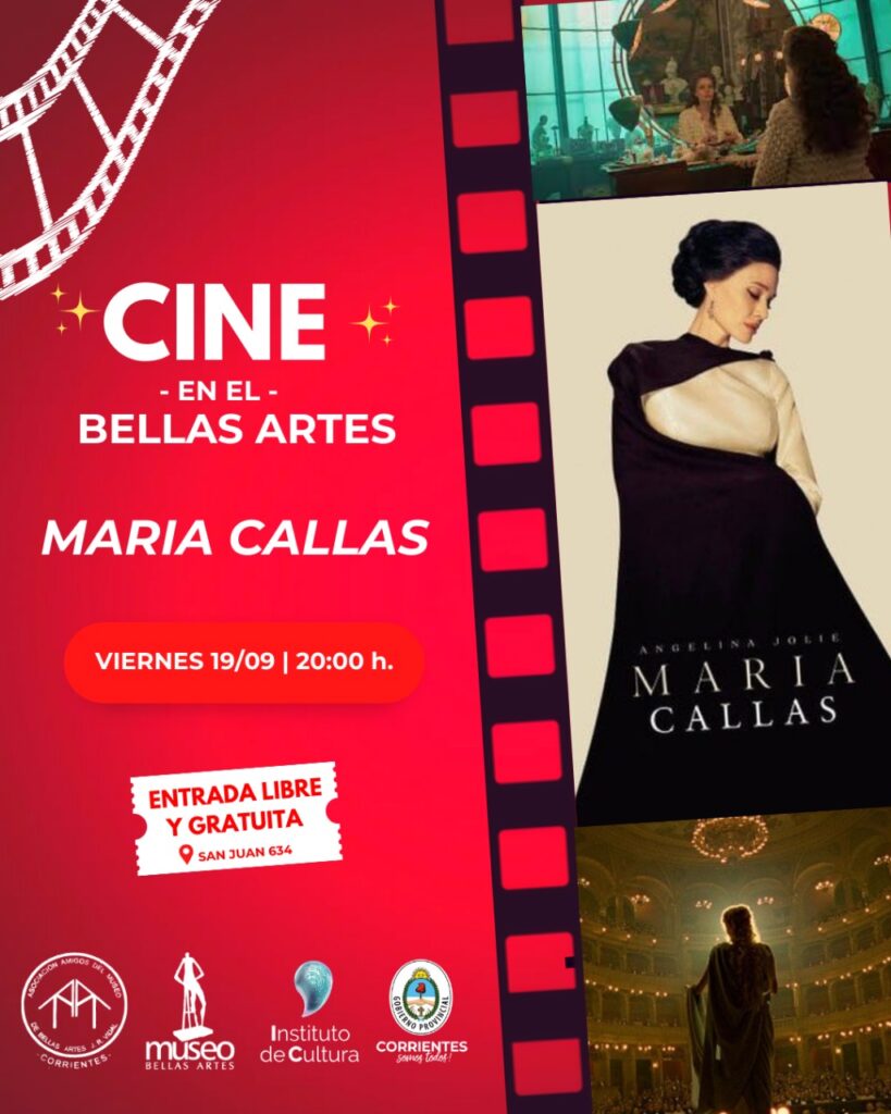 El viernes 19 de septiembre a las 20 el Museo de Bellas Artes propone para su ciclo de cine el film «María» del director chileno Pablo Larrain,producción del año 2024 y que conforma la trilogia con «Jackie» y «Spencer» ,un homenaje a tres grandes mujeres icónicas.
