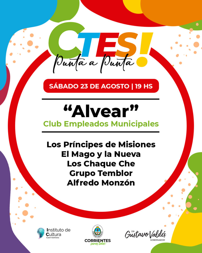 El Gobierno de la Provincia de Corrientes y el Instituto de Cultura invitan al público en general a disfrutar de Corrientes Punta a Punta. El día sábado 23 de agosto a las 19 hs en el Club Empleados Municipales de Alvear. La velada contará con la presencia de destacados artistas como Los Príncipes de Misiones, El Mago y la Nueva, Los Chaque Che, Grupo Temblor y Alfredo Monzón.