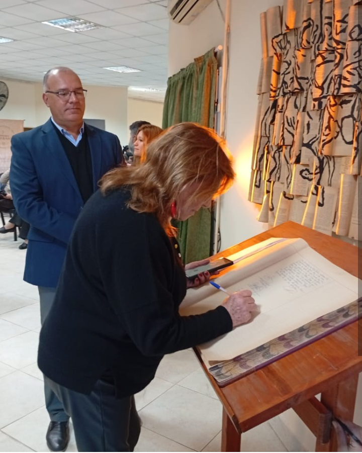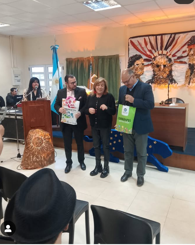 Acompañada por el intendente de Caá Catí, Jorge Meza, la funcionaria provincial firmó el libro histórico de la Biblioteca Popular Juan Manuel Rivera, entregó la declaración de interés cultural de la Feria (Resolución N° 0647) e hizo entrega publicaciones realizadas por el ICC.