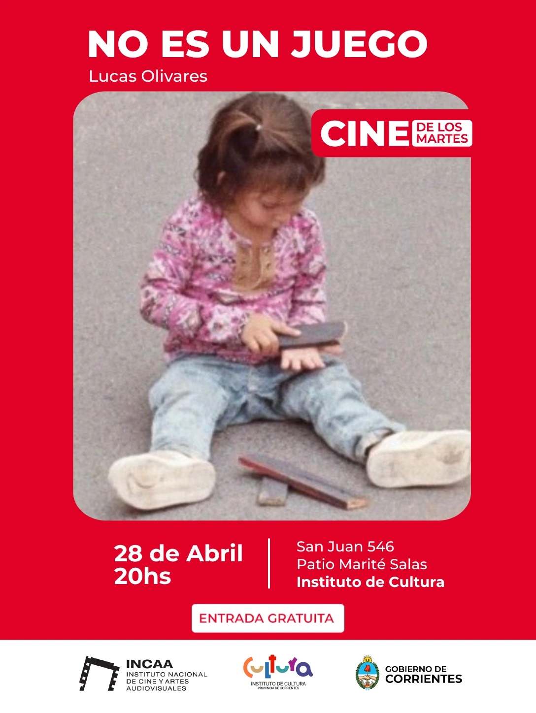 A continuación, se presentará “No es un juego” (2021), de Lucas Olivares, que recupera registros de una movilización frente al Tribunal Penal Nº1 de la ciudad de Corrientes. A través de la voz de una niña, el relato interpela sobre la justicia y el accionar institucional, aportando una perspectiva íntima y contundente.