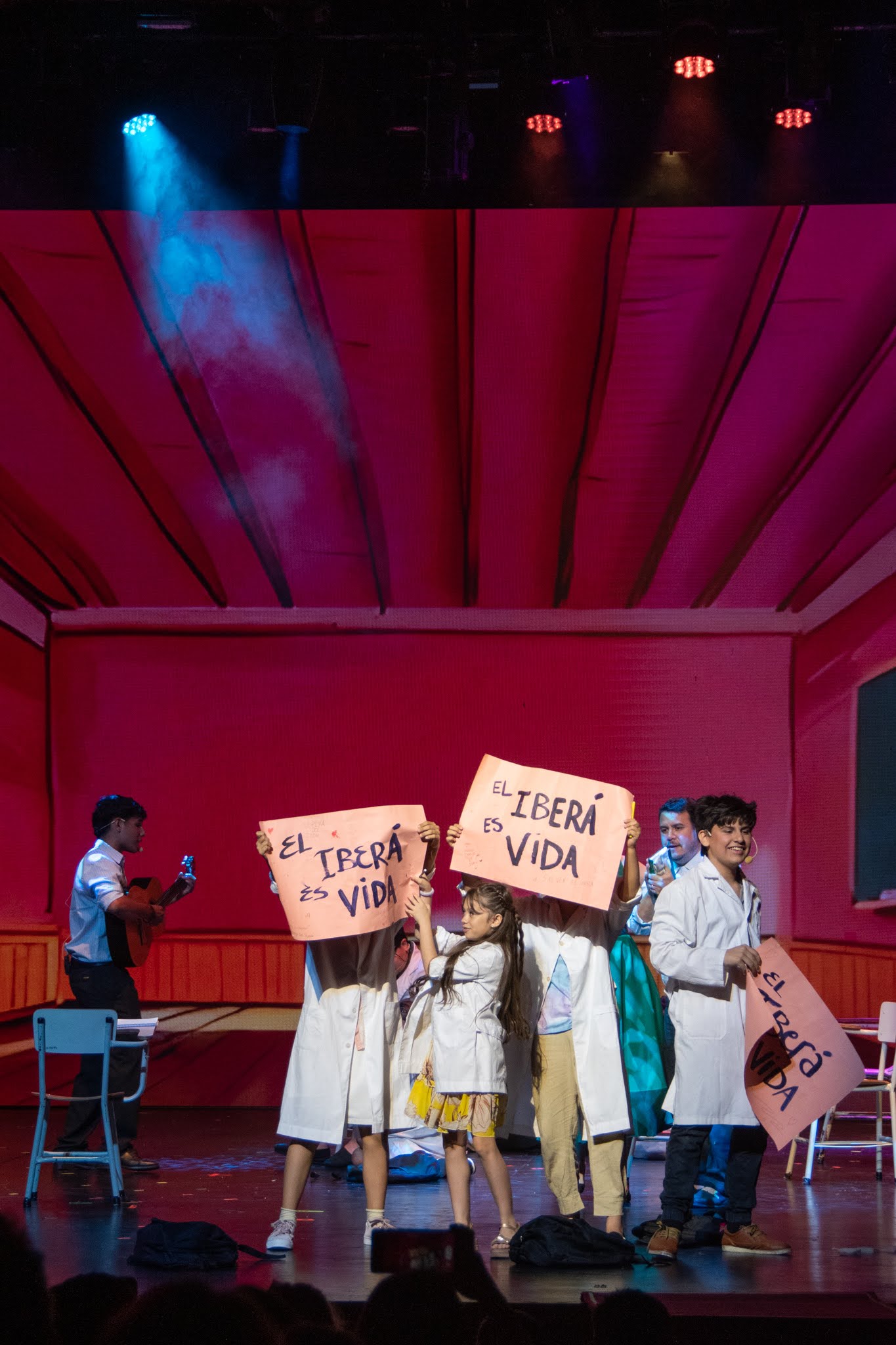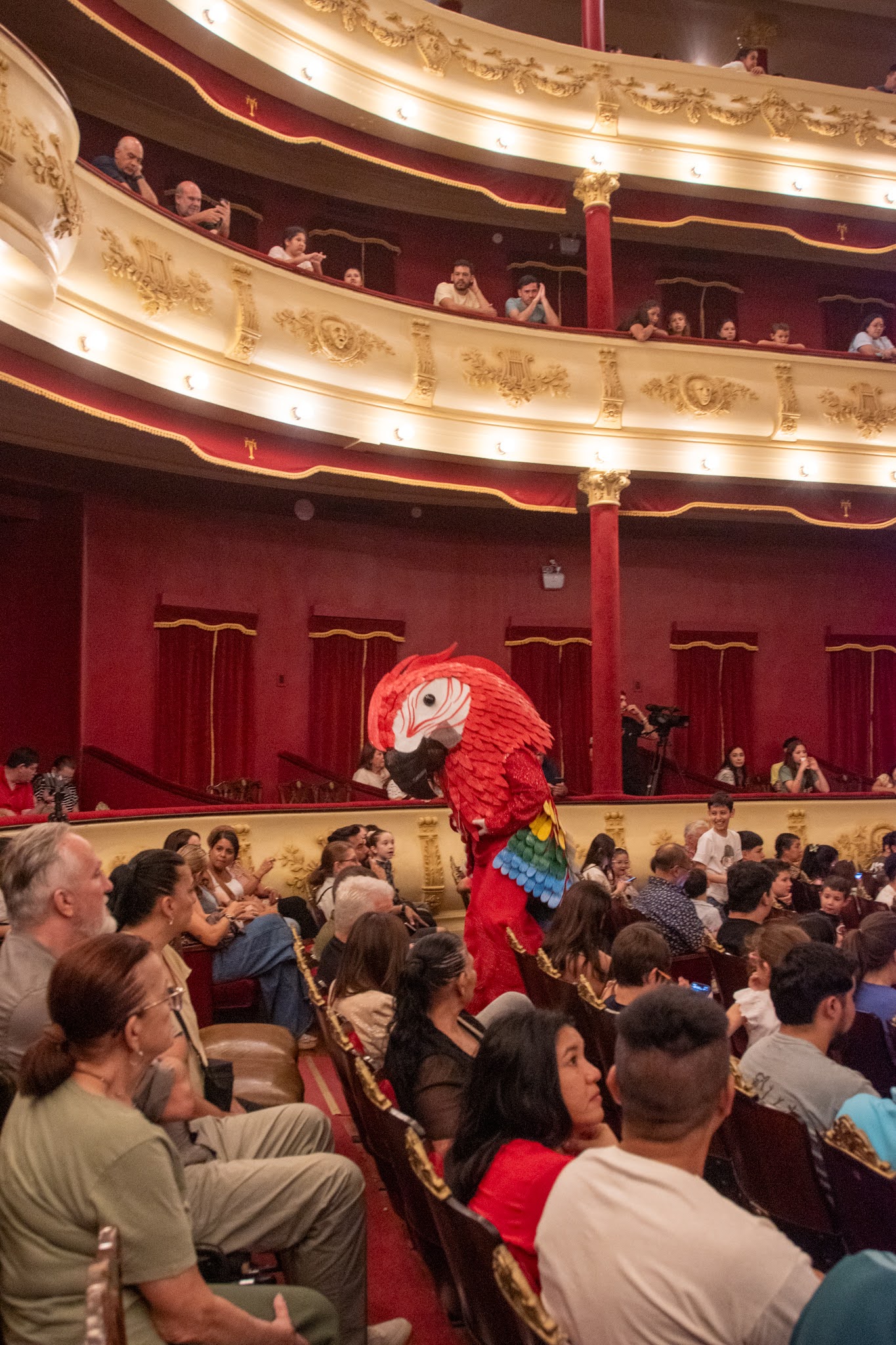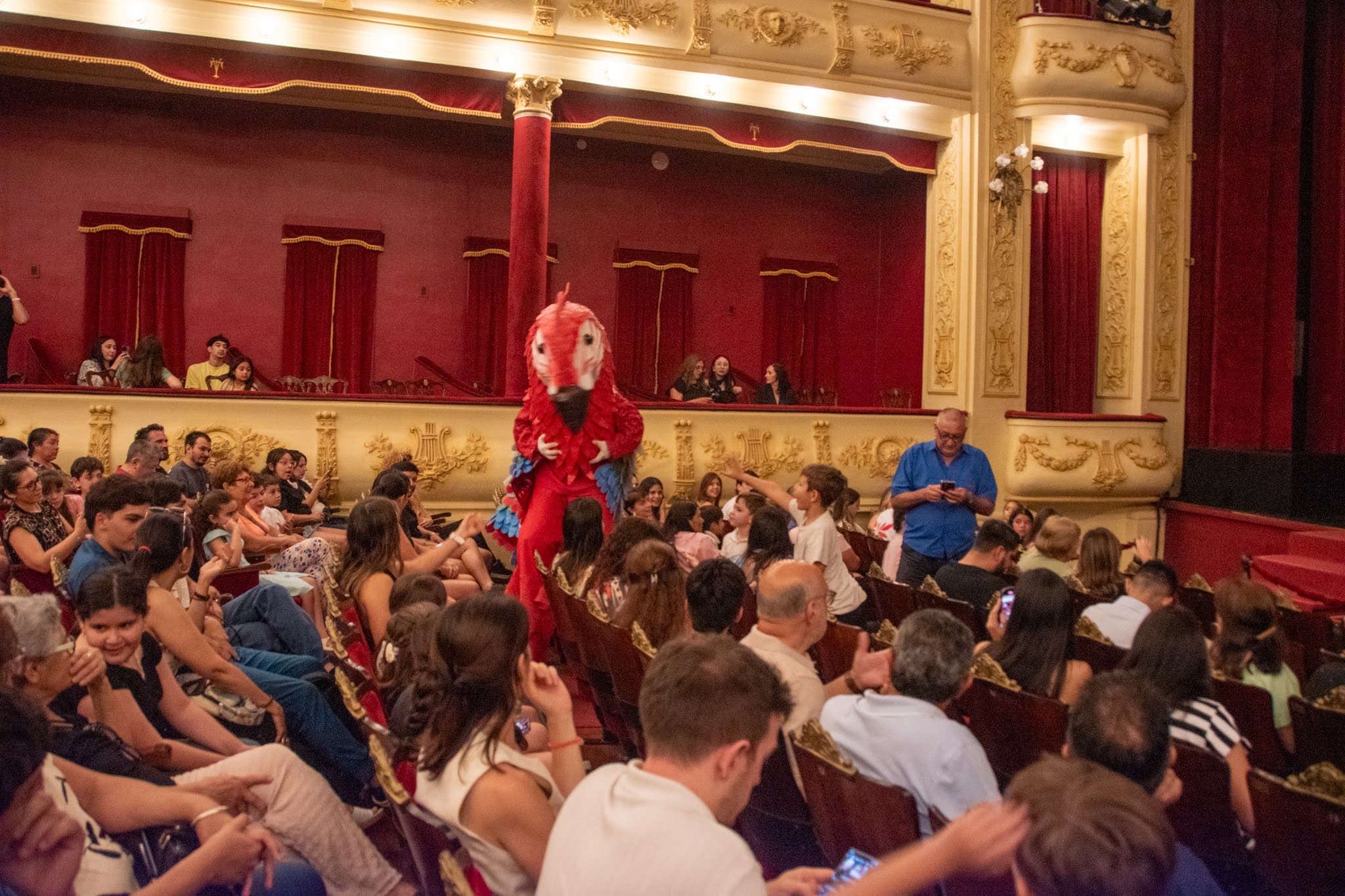 Dos actores caracterizados como Guacamayos rojos gigantes se instalaron a las 9.30 de la mañana de este jueves para recibir a los más de 400 chicos de la escuela Nº1 Manuel Belgrano, más de 100 de la escuela Nº 10 y cerca de 80 de la escuela Normal “Juan Pujol”, quienes fueron especialmente invitados por el Ministerio de Educación para disfrutar de la puesta en escena del musical “Epopeya del Iberá”; en el segundo de tres días de funciones.