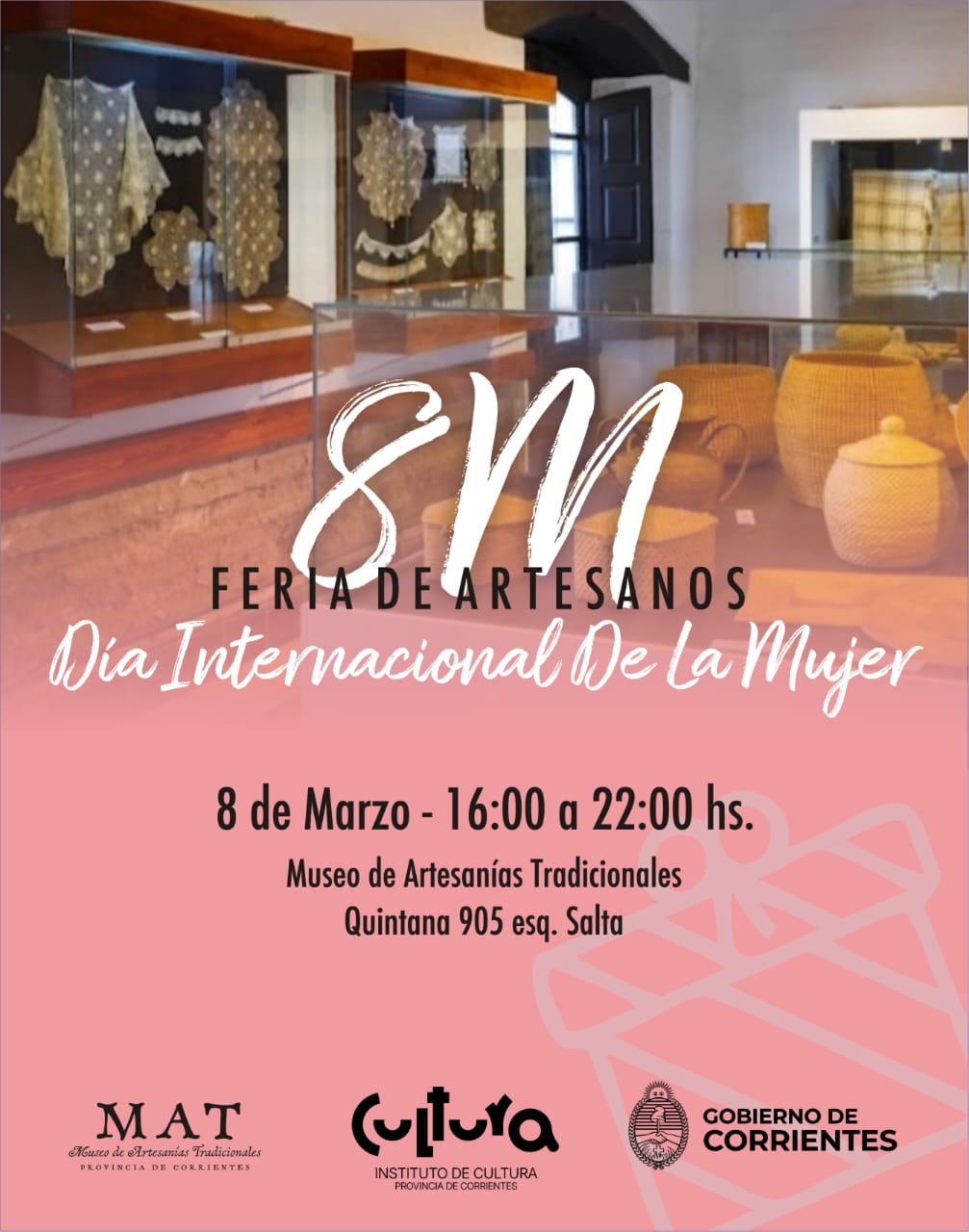 Publicado el 04.3.26 La presidenta del Instituto de Cultura Corrientes Lourdes Sánchez y la Dirección de Museos tienen el agrado de invitar a toda la comunidad a la Feria de Artesanías Regional, un encuentro especial en el marco del Día Internacional de la Mujer.
