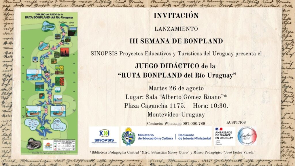 III Semana de BonplandMuseo de Ciencias Naturales “Dr. Amado Bonpland” Sinopsis Proyectos Educativos y Turísticos del Uruguay presenta el Juego Didáctico de la “Ruta Bonpland del Rio Uruguay” Martes 26 de agosto Lugar: Sala “Alberto Gómez Ruano”. Plaza Cagancha 1175. Hora: 10:30. Montevideo – Uruguay