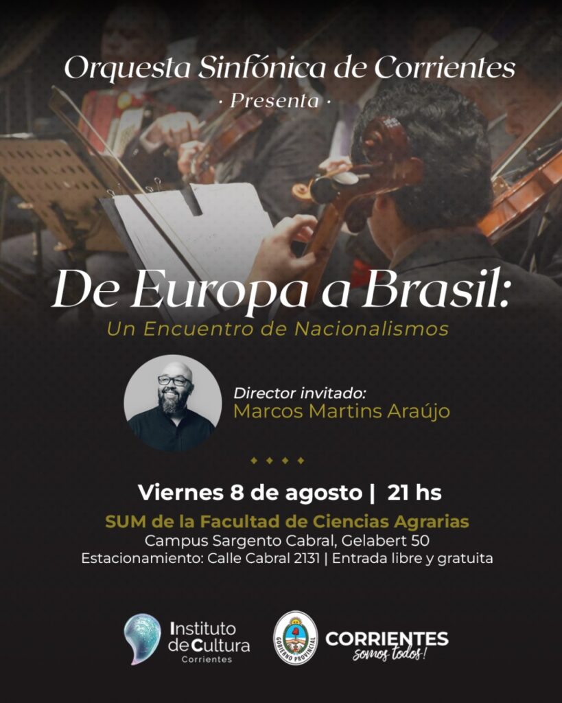 El Instituto de Cultura de la Provincia invita a la comunidad local a asistir al nuevo concierto de la Orquesta Sinfónica de Corrientes. En esta oportunidad, titulada “De Europa a Brasil: Un Encuentro de Nacionalismos” con director brasilero invitado.