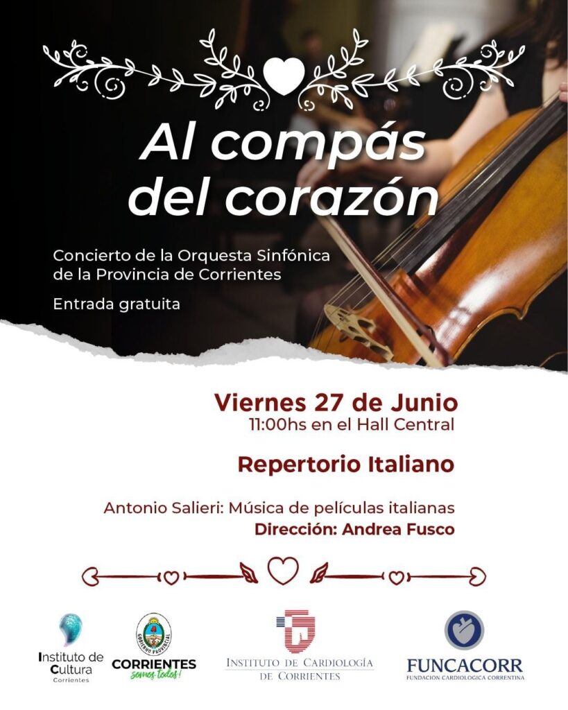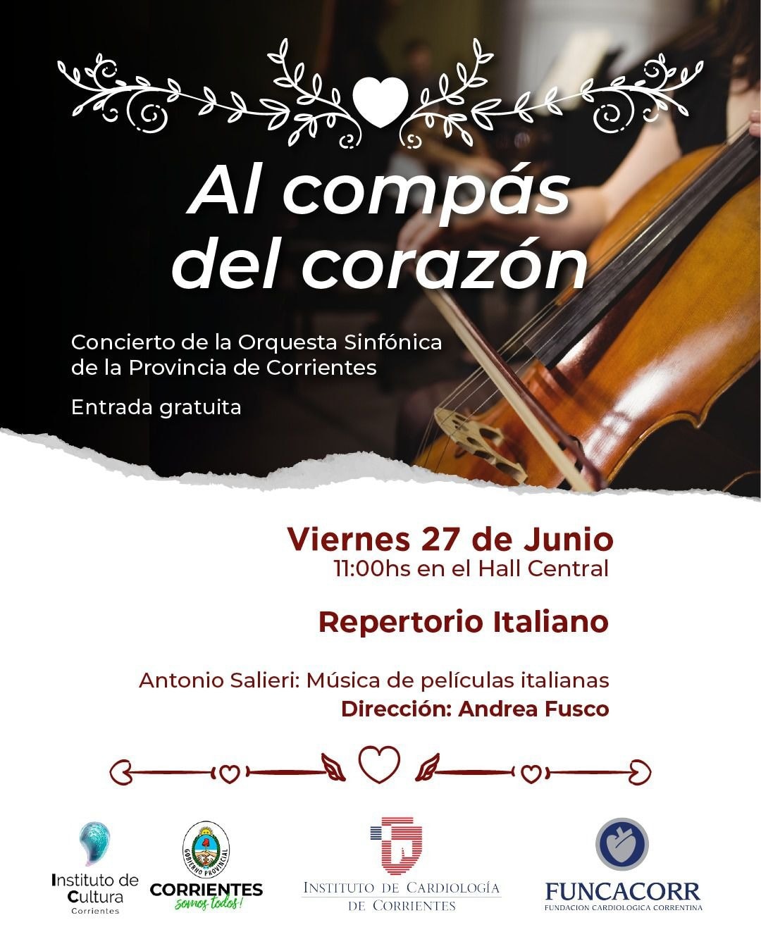 El próximo viernes 27 de junio a las 11:00 hs, el Instituto de Cardiología de Corrientes, FUNCACORR y el Instituto de Cultura, se unen nuevamente con la Orquesta Sinfónica de la Provincia, con quienes compartimos una larga trayectoria de actividades conjuntas que acercan el arte a la salud.