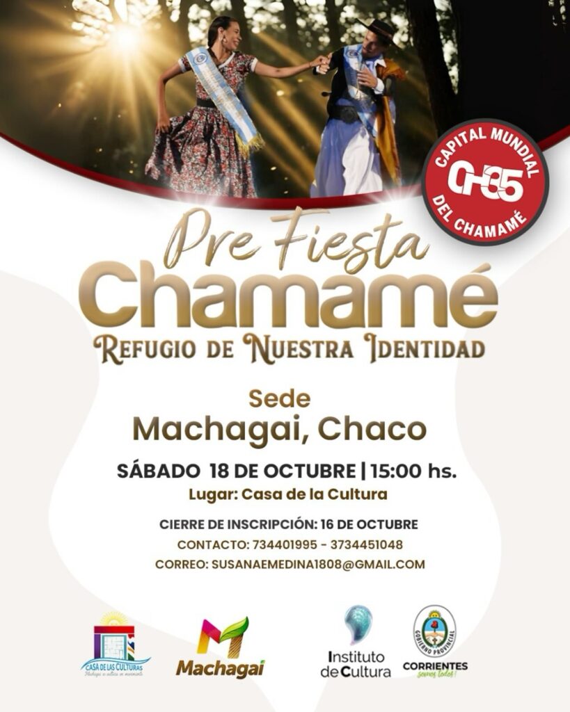 El Instituto de Cultura te invita a ser parte de la Pre Fiesta del Chamamé “Refugio de Nuestra Identidad” en Machagai, Chaco. Es una oportunidad única para vivir la música y la tradición de nuestra tierra, compartiendo una tarde llena de emoción y arte.