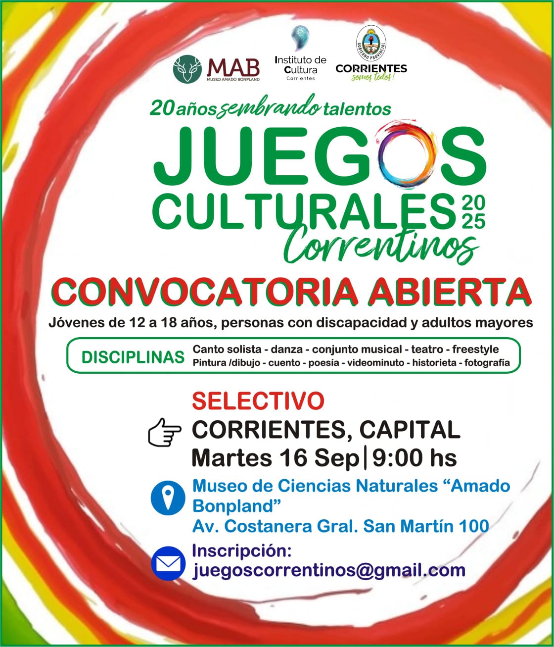 El Instituto de Cultura de Corrientes (ICC) abre la convocatoria para participar de la instancia municipal de los Juegos Culturales Correntinos 2025, en la ciudad de Corrientes, que se desarrolla bajo el lema “20 años sembrando talentos”. Este selectivo se realizará el martes 16 de septiembre, a partir de las 9, en el Museo de Ciencias Naturales Amado Bonpland, ubicado en Av. Costanera Gral. San Martín 100.