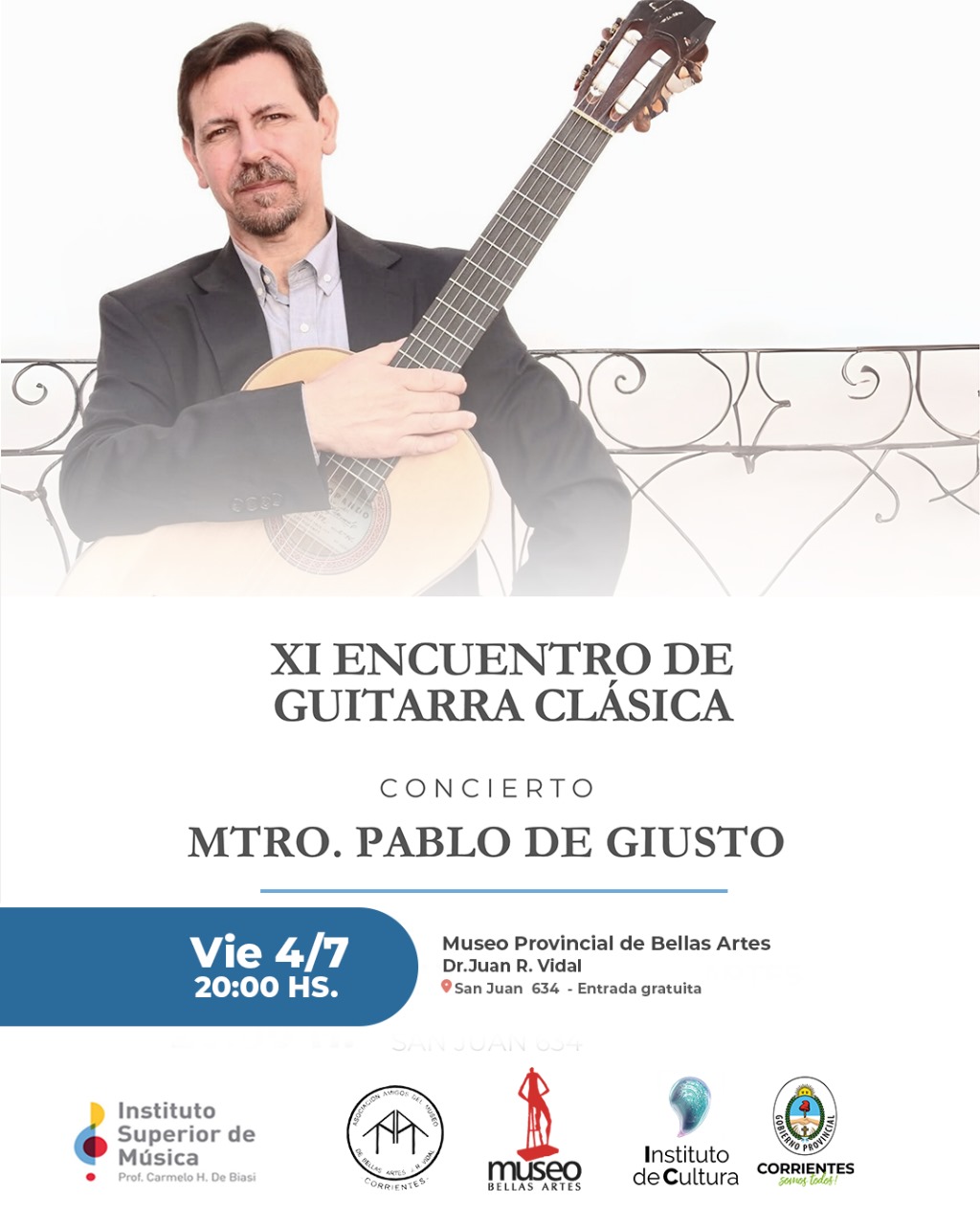 El Instituto de Cultura de Corrientes y el Museo de Bellas Artes tienen el agrado de invitarte al XI Encuentro de Guitarras Clásicas contará con un concierto muy especial a cargo del talentoso Pablo De Giusto.